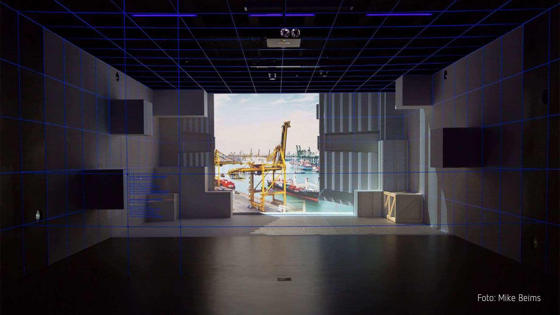 Video data can be arranged and distorted in the room so that it is projected onto a complex geometry using eleven projectors. In addition, an iPad app allows the individual surfaces of the projection to be adapted to the existing surfaces in the room in real time.